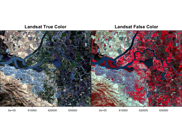 plotRGB(landsatFCC, axes=TRUE, stretch="lin", main="Landsat False Color")