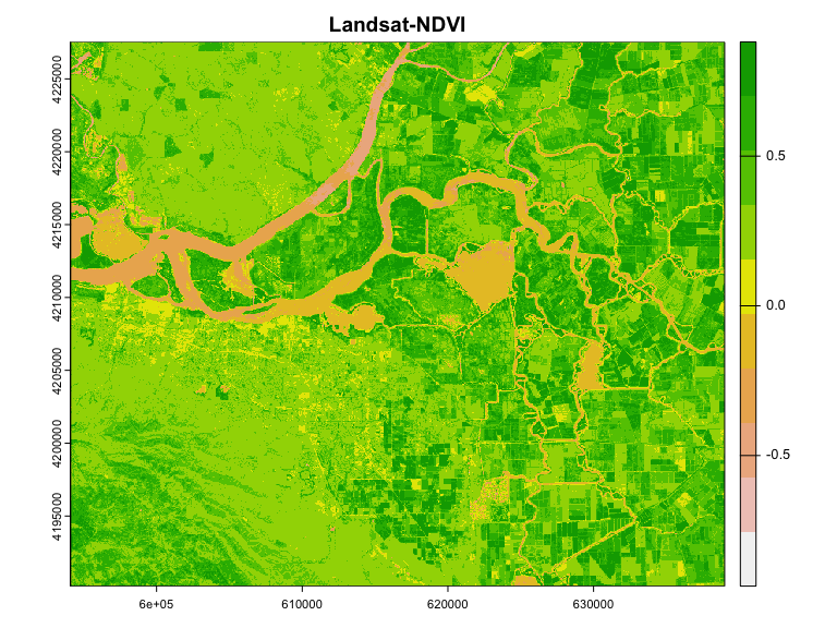 plot(ndvi, col=rev(terrain.colors(10)), main="Landsat-NDVI")